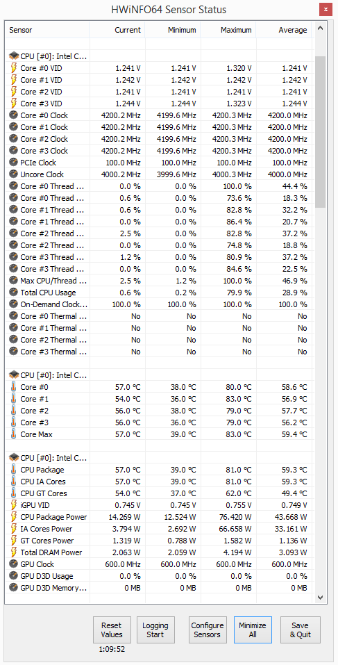 Jako poslední kapku, která mě donutila zbavit se procesoru, dokud má aspoň nějakou cenu (pro informaci skoro stejnou jako Core i7 2600K bez záručního listu), uvedu hru Watch_Dogs. V této hře mi jel procesor na napětí, které by mělo pracovat pouze při využití AVX2 instrukcí, což se nejspíš ve Watch_Dogs děje. Následující screenshot pojednává o provozních vlastnostech procesoru, při hraní této hry na výkonném vodním CPU okruhu za 13.000,-Kč.
