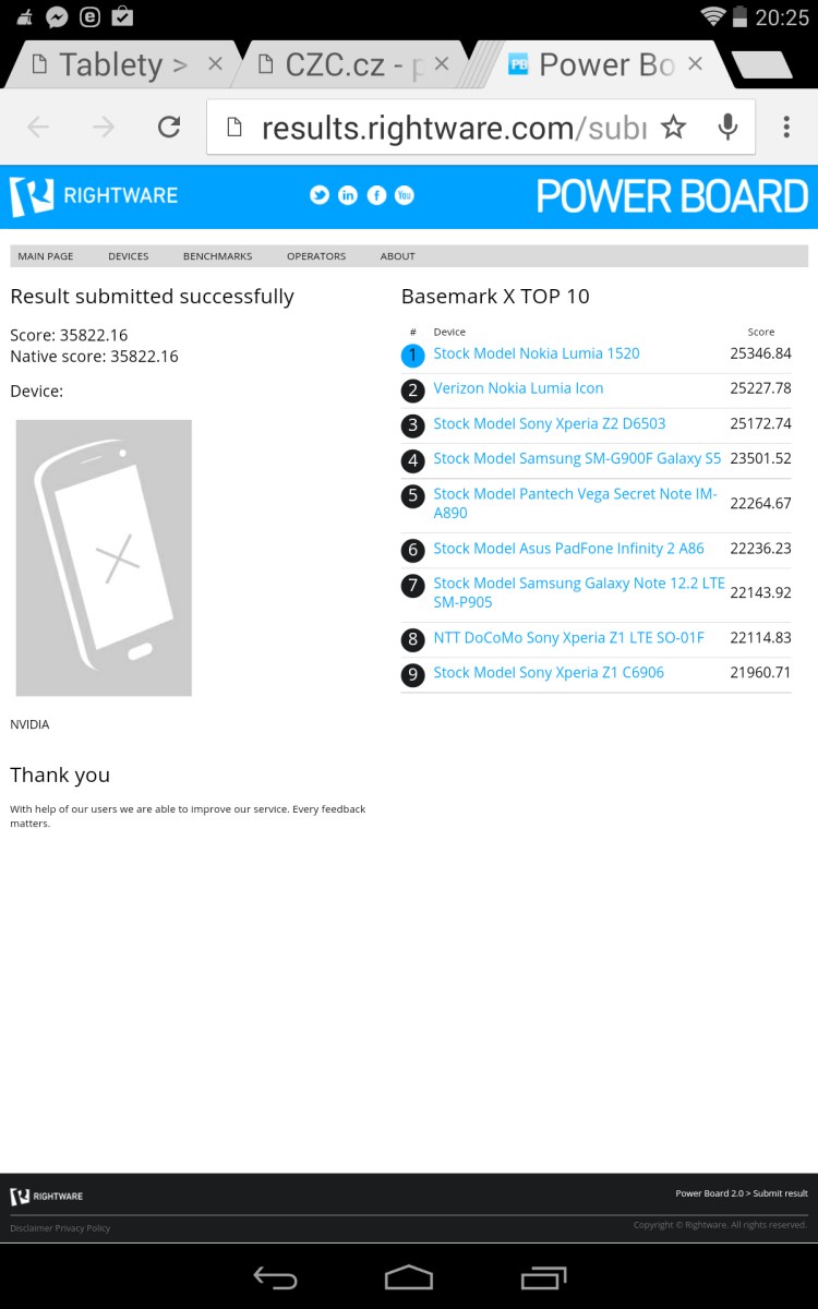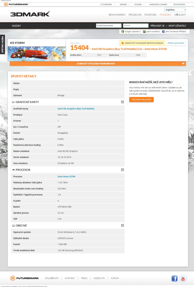 Dle screenu použitého z tabletu vydíte skóre z Ice Storm Unlimited, jelikož u ostatních verzí tohoto benche se mi ukázala hláška Maxed Out a abych zvolil jiný typ tohoto benchmarkového nástroje.